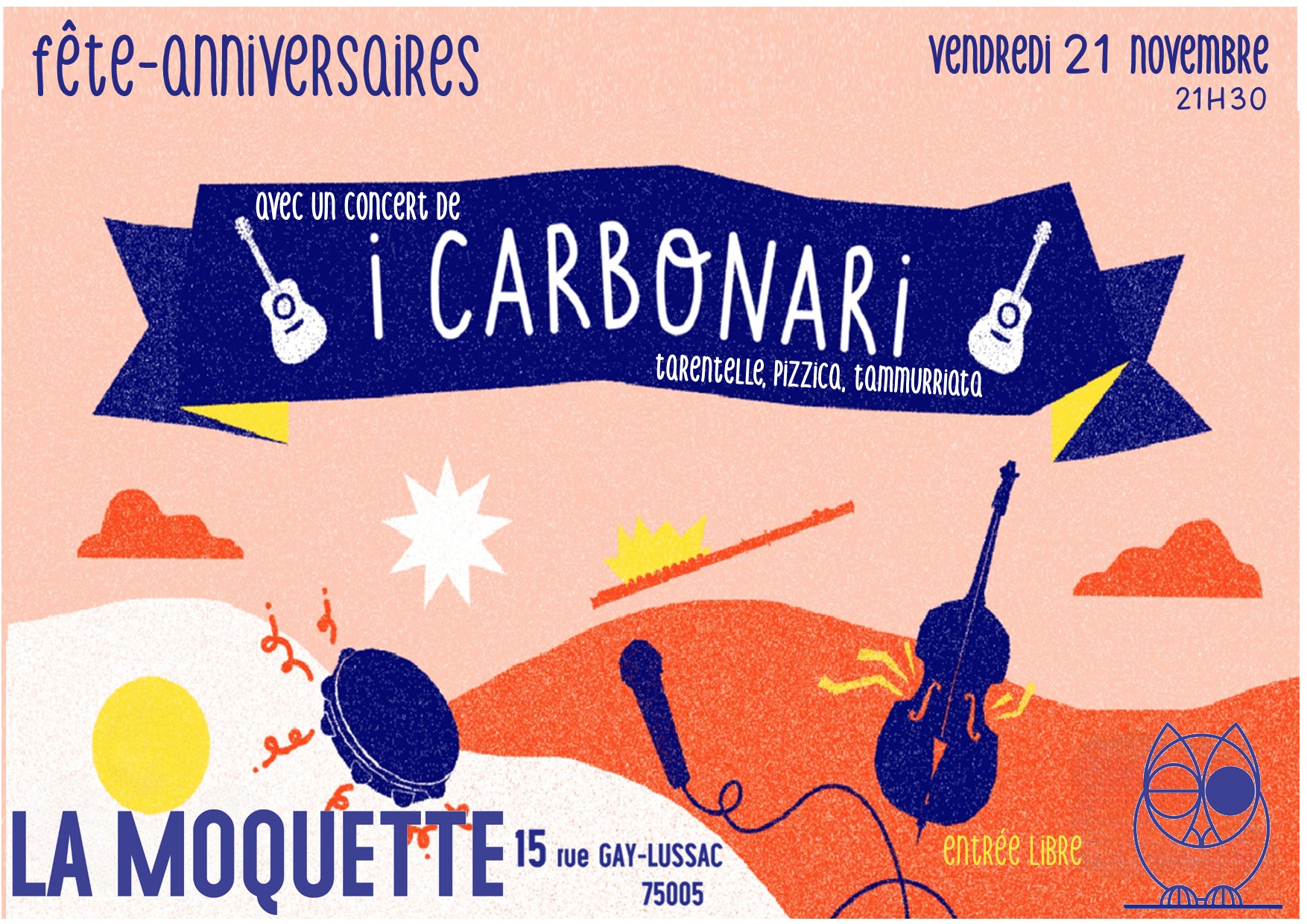 Le vendredi 21, la fête des anniversaires de novembre sera l’occasion de danser au rythme des folklores du sud de l’Italie avec I Carbonari. Cet orchestre de guitares, de tambourins, violons, mandoline, flûte et violoncelle nous fera découvrir différents types de tarentelles, musiques jouées dans les Pouilles, la Calabre ou la Campanie et provoquant des danses énergiques voire frénétiques, plongeant le public dans une forme de transe euphorisante.