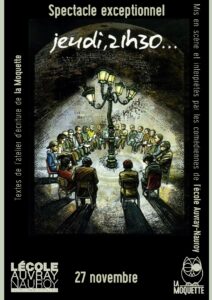 Cette année encore, des comédien·ne·s de l’école Auvray-Nauroy répondent à la proposition de Compagnons de la nuit : mettre en scène, dire ou lire des textes issus de l’atelier d’écriture du jeudi soir. Certains datent d’hier, d’autres de plus loin et sont sélectionnés par les interprètes de manière complètement subjective. Le spectacle nous sera offert le jeudi 27 novembre.